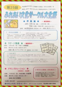 「第25回ふれあい文化サークル文化祭」が春日市ふれあい文化センターにおいて、3月7日(金)~3月9日(日)の3日間開催され、ファイブネット春日が初参加しました。