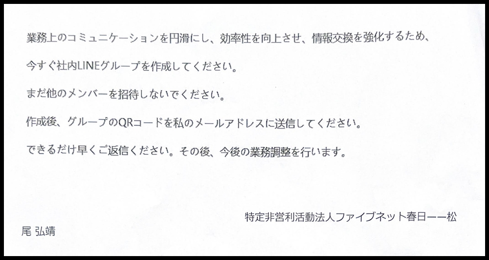 NPO法人ファイブネット春日の名を騙りLINEグローブの作成を指示するフイシング詐欺事案の発生が、1月20日(火曜)午前にありました。現在のところ被害はないようですが、今後も不審なメールが届く可能性がありますので十分に注意が必要です。